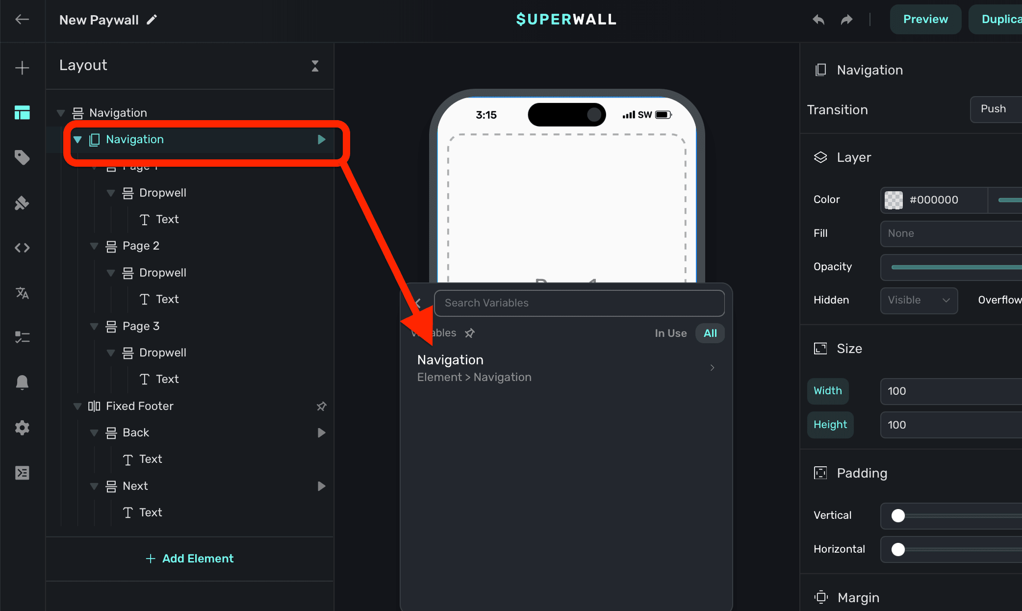 When a navigation element is added, Superwall automatically creates an element variable for it (accessed through the Variables tab in the left sidebar, or the variables button in the floating toolbar). Its name will match whatever is in the element hierarchy in the left sidebar: