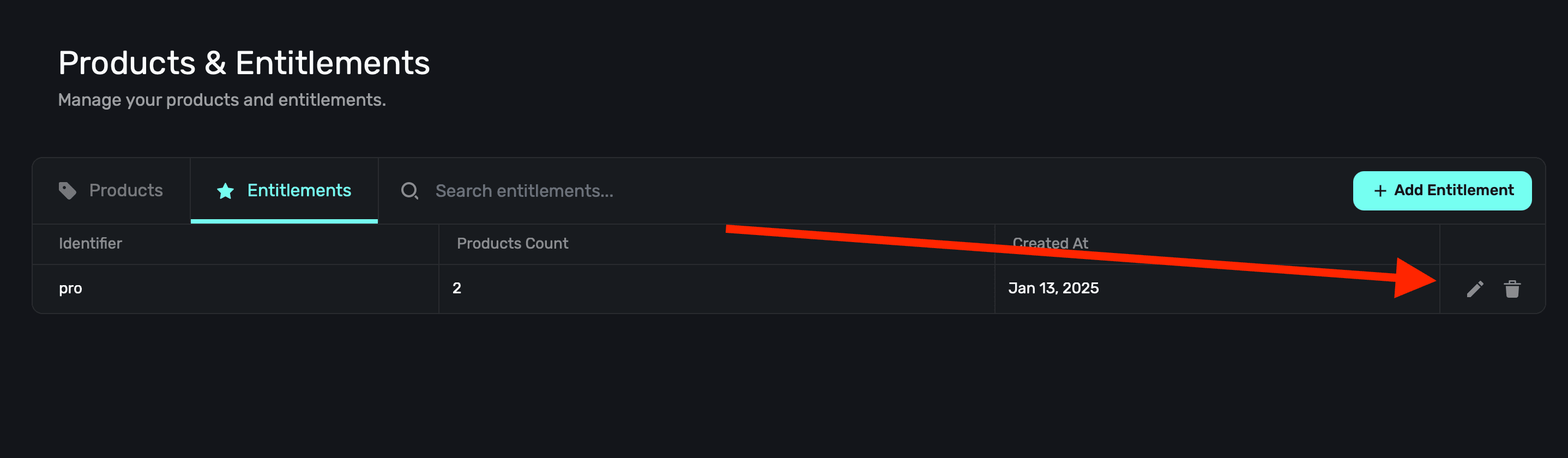 To edit or delete an entitlement, click on the trailing pencil icon or the trash can icon to remove one. Note that if your entitlement is associated with any product, you'll need to remove it first before you can delete it.